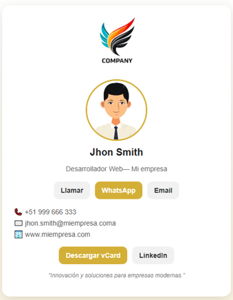 Diseños modernos y funcionales, con botones interactivos, código QR y personalización completa. Ideal para profesionales y empresas.